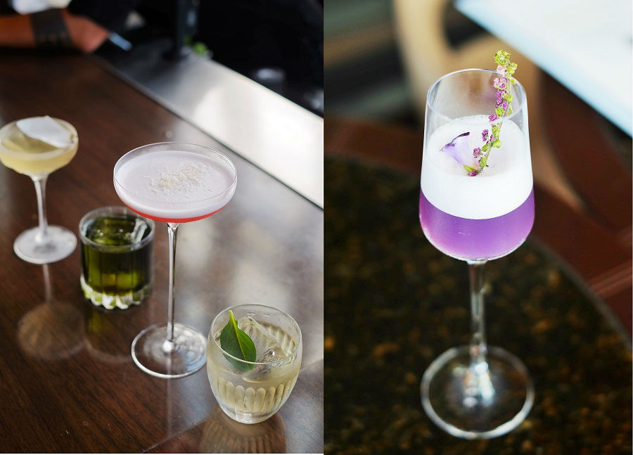 左の写真はアグン・プラボー氏によるカクテルの数々。右手前から、『移動祝祭日』『キリマンジャロの雪』『日はまた昇る』『エデンの園』。写真右はザ・バーのヘッドバーテンダー和田健太郎氏のオリジナルカクテル『六ムラサキ』。