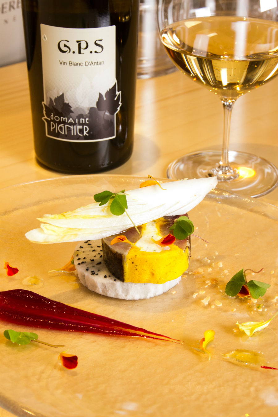 真鯖と日高のフロマージュブラン 雪化粧のマーブル仕立てドラゴンフルーツとビーツとフランボワーズのビネグレッド 2200円(2名様分)※写真は1名様分。合わせたワインはジュラの白。ペアリングの素晴らしさを実感!